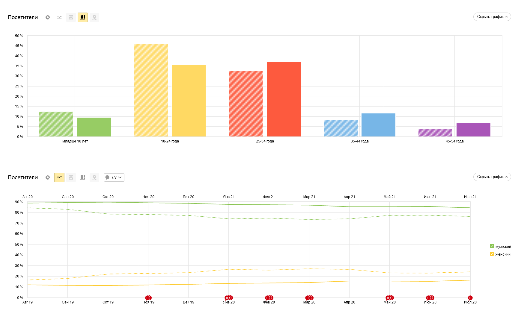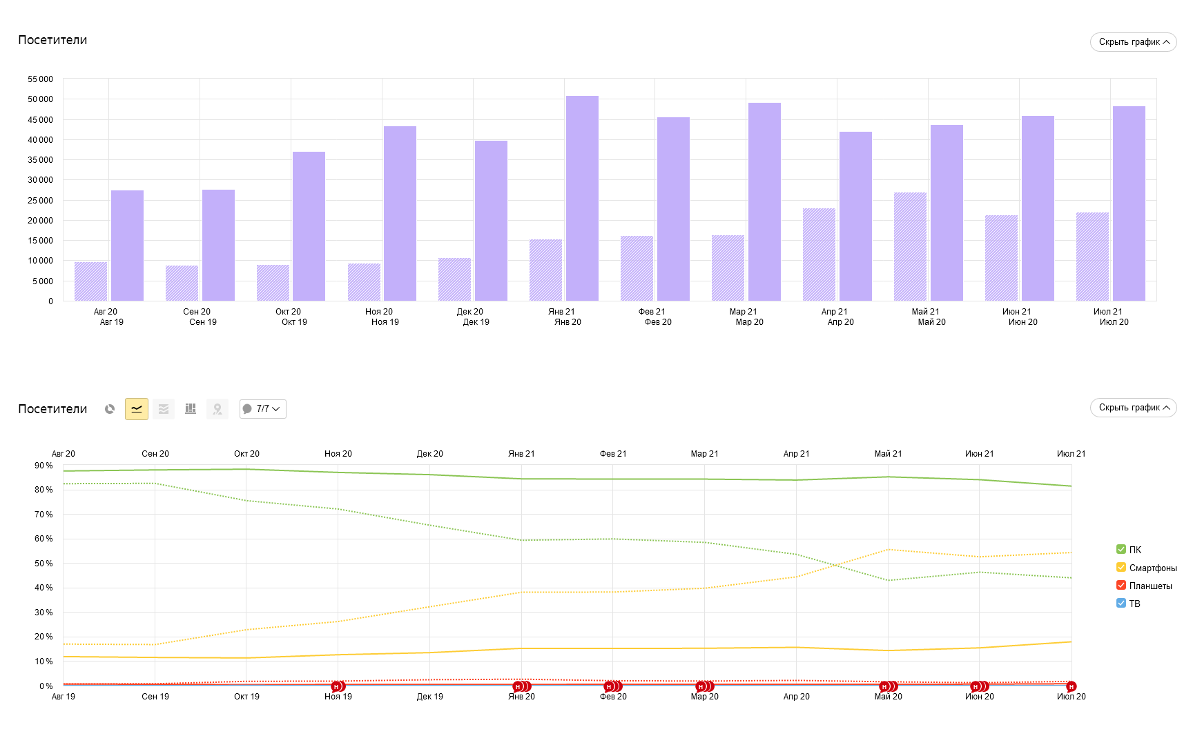 За прошедший год мы сильно выросли по посещаемости: за период с августа 2020 по июль 2021 сайт посетило более 475 тысяч человек, тогда как годом ранее — всего 172 тысячи. Рост почти трёхкратный! Среднедневная посещаемость на данный момент составляет около 1500-2000 посетителей.
