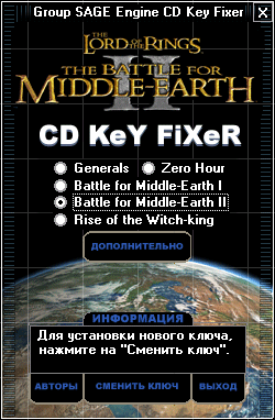 - Запускаем CDKeyFixer (ссылка на скачивание есть в примечании ниже). В главном окошке выбираем "The Battle for Middle-Earth II". Затем нажимаем на кнопку "Дополнительно", расположенную ниже.